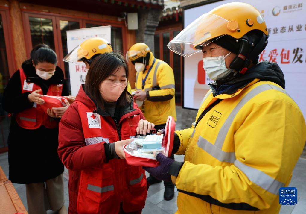当日,中国红十字基金会联合爱心企业发起“汇思霖珑新业态从业者关爱行动”,向北京的快递、外卖人员等免费发放2000只“防疫关爱包”,在新年来临之际为他们送去关爱和健康。新华社记者 刘勇贞 摄