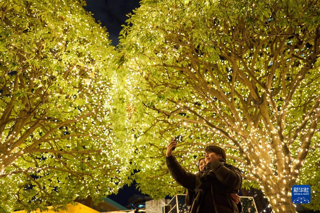 12月25日,游客在日本东京惠比寿花园点亮灯光的树下合影留念。