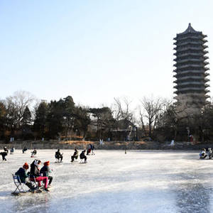 2022年最后一天,在北京大学未名湖冰场,人们滑冰、玩冰车,在感受冰上运动的魅力中喜迎新年。