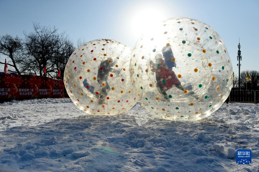 12月31日,游客在圆明园雪场体验雪地悠波球。