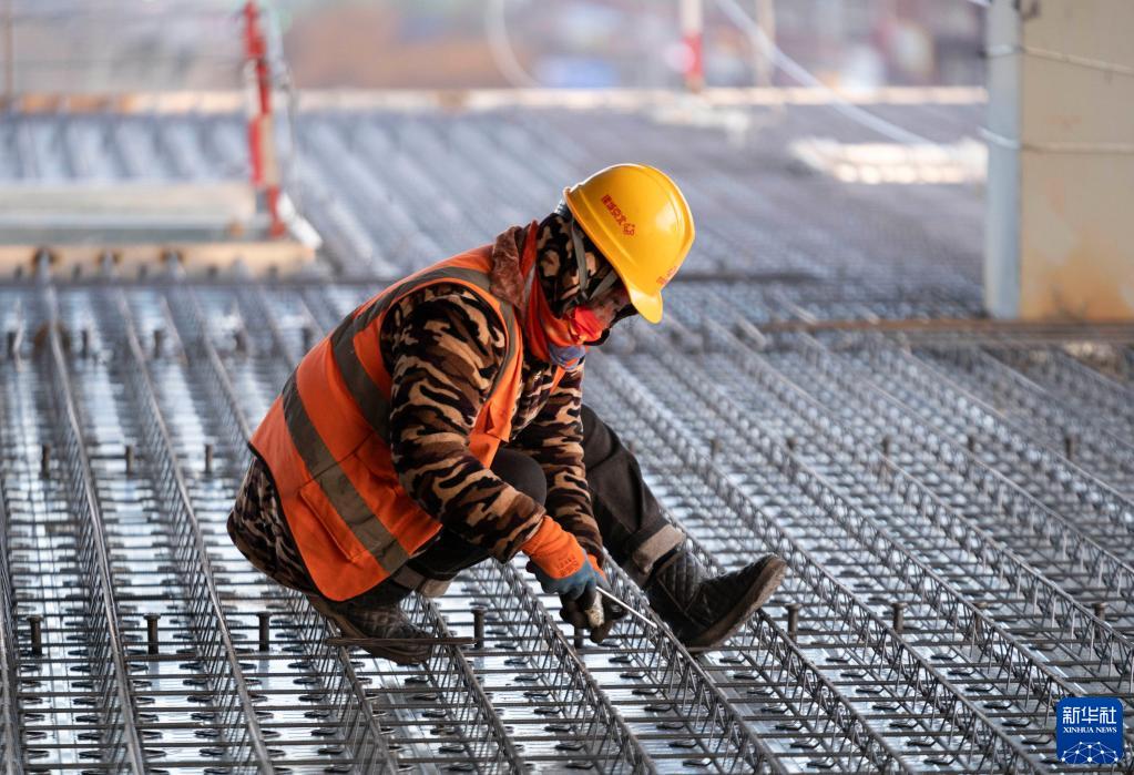 12月31日,在北京市丰台区档案馆建设项目工地,钢筋工孙会琴在做钢筋绑扎。
