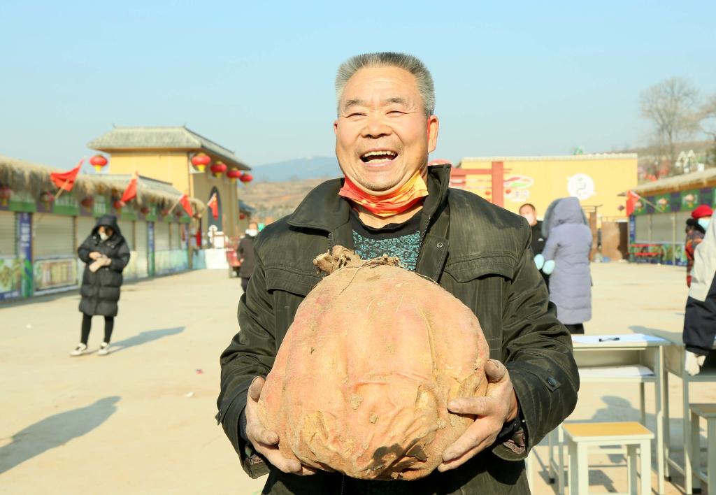 12月30日,在汝阳红薯擂台赛上,农民展示参赛的红薯。