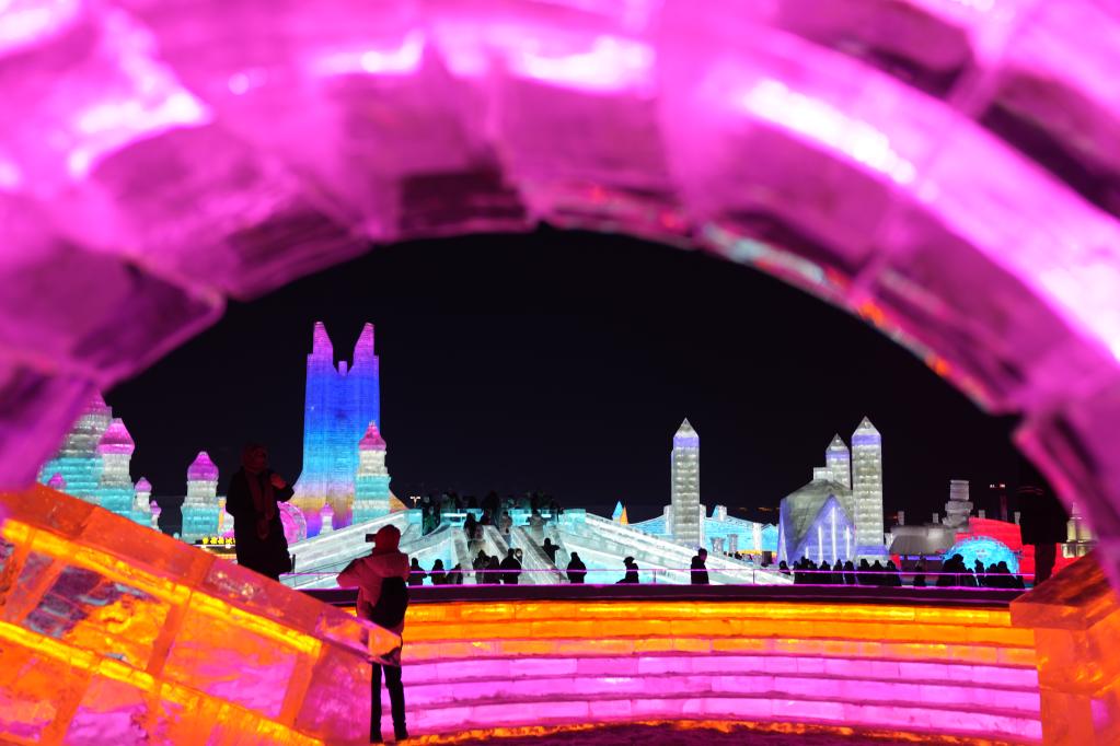 12月31日,游客在哈尔滨冰雪大世界园区游玩。