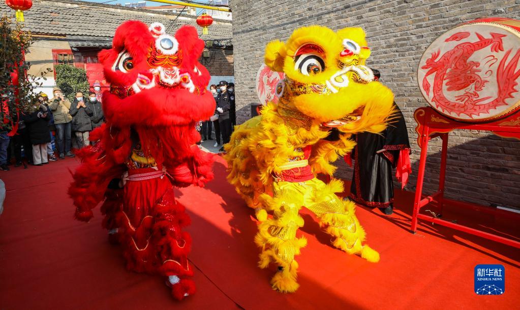 2022年12月31日,在江苏省淮安市都天庙历史风貌区举行的传统民俗祈福迎新年活动上,市民观看舞狮表演。