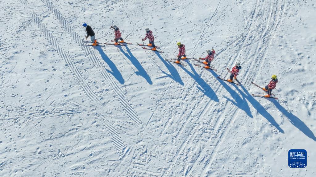 2022年12月31日,滑雪爱好者在河北省遵化市一家滑雪场练习滑雪(无人机照片)。