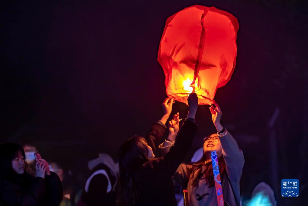 1月1日,群众在贵州省黔西市水西公园放飞孔明灯寄托新年的祝福。