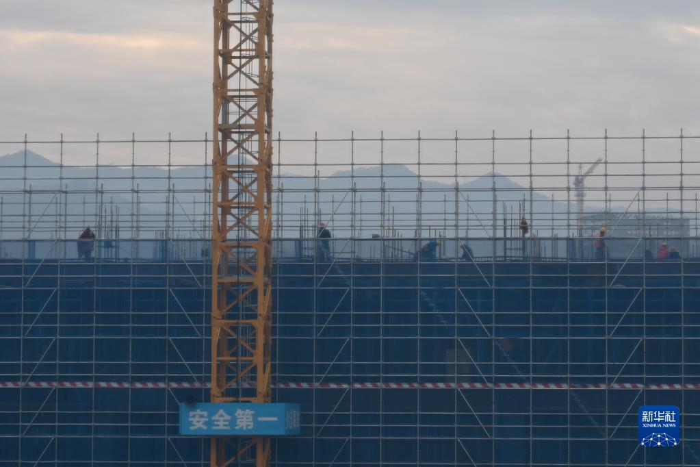 1月1日清晨,中建三局建设者在位于浙江省杭州市富阳区银湖生物产业园总承包工程项目现场施工。