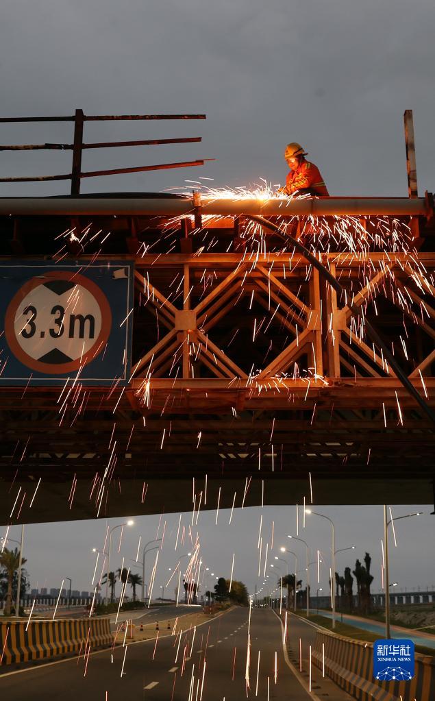 1月1日,在新建福(州)厦(门)铁路泉州湾跨海大桥施工现场,建设者在作业。