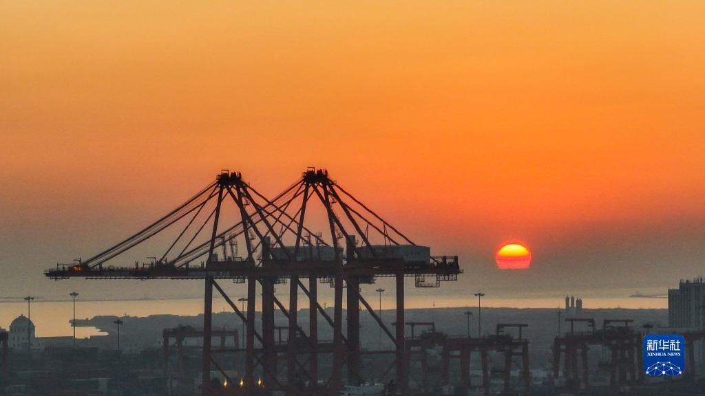 1月1日,晨光中的河北唐山港京唐港区码头(无人机照片)。