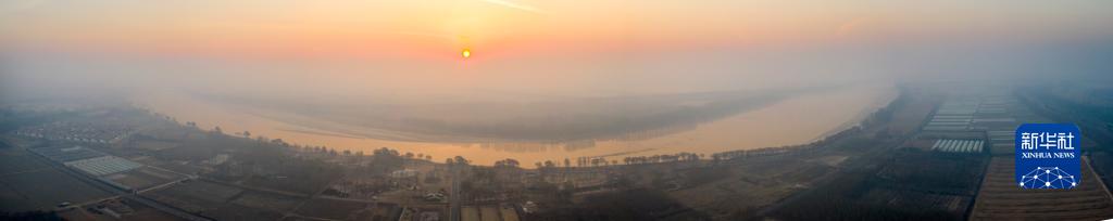 1月1日,在山东省滨州市滨城区市西街道黄河小街湾生态公园拍摄的日出(无人机全景照片)。