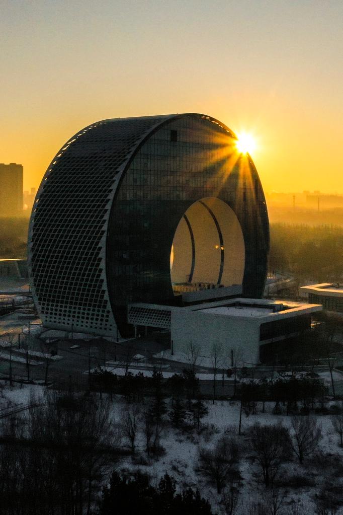 这是1月1日在吉林省长春市拍摄的晨曦中的一汽红旗创新大厦。
