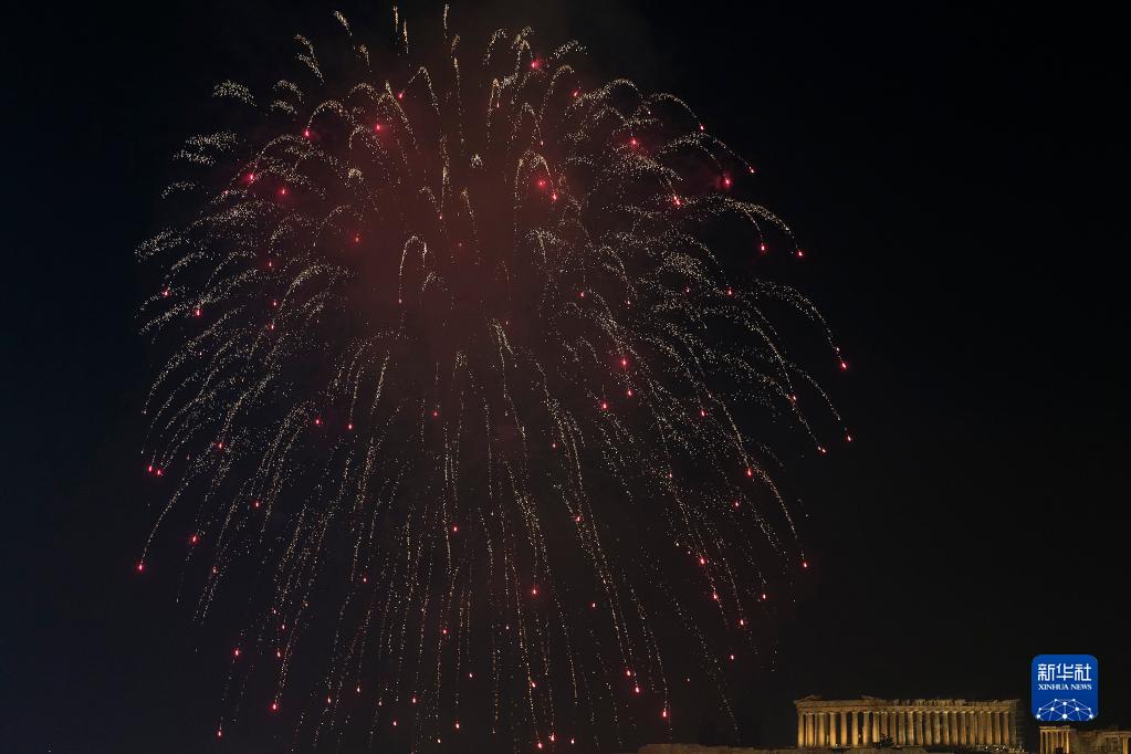 这是2023年1月1日在希腊雅典卫城拍摄的新年烟花。