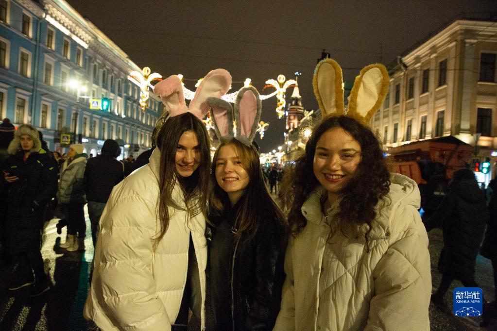 2022年12月31日,人们在俄罗斯圣彼得堡街头迎接新年到来。