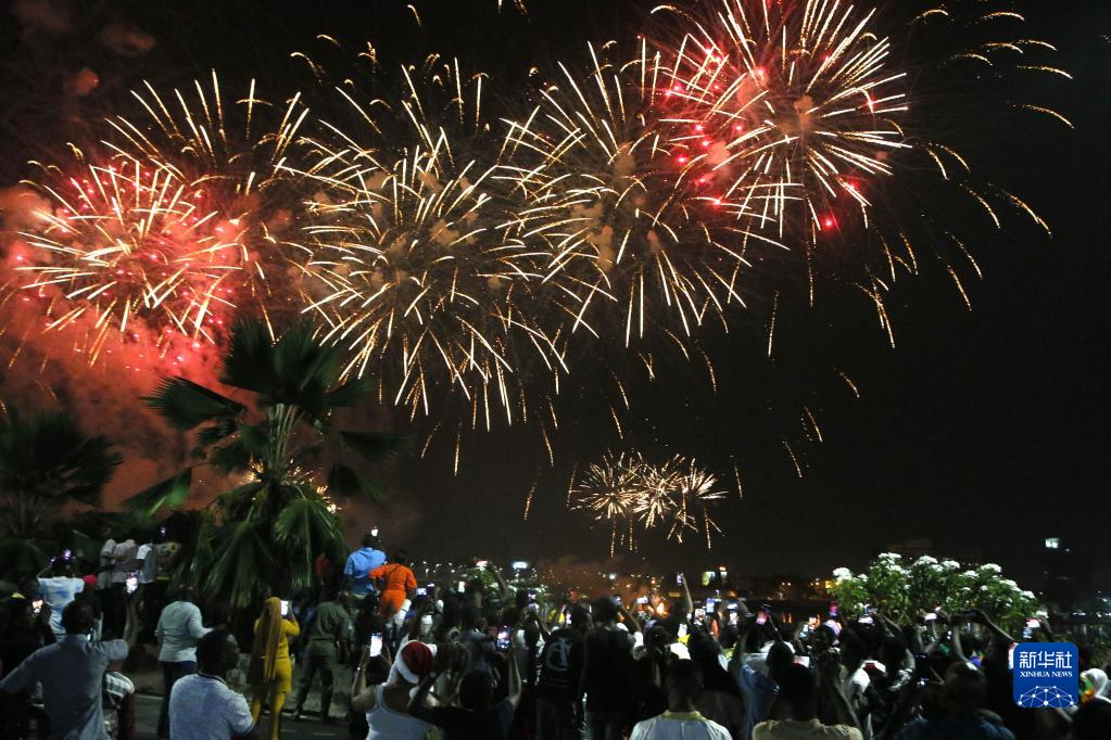 2023年1月1日,人们在科特迪瓦经济首都阿比让观看烟花表演。