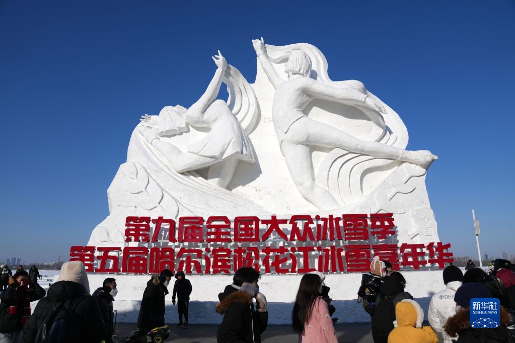 1月1日,游客进入哈尔滨松花江冰雪嘉年华园区游玩。