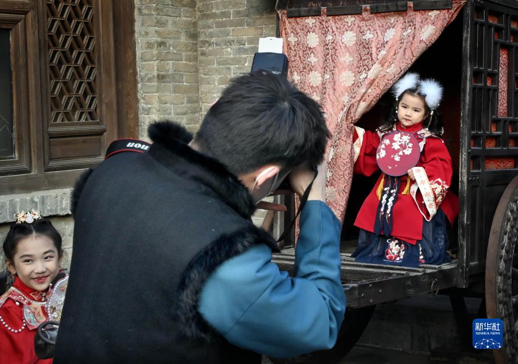 小朋友在位于郑州市中牟县的电影小镇拍照(2022年12月31日摄)。