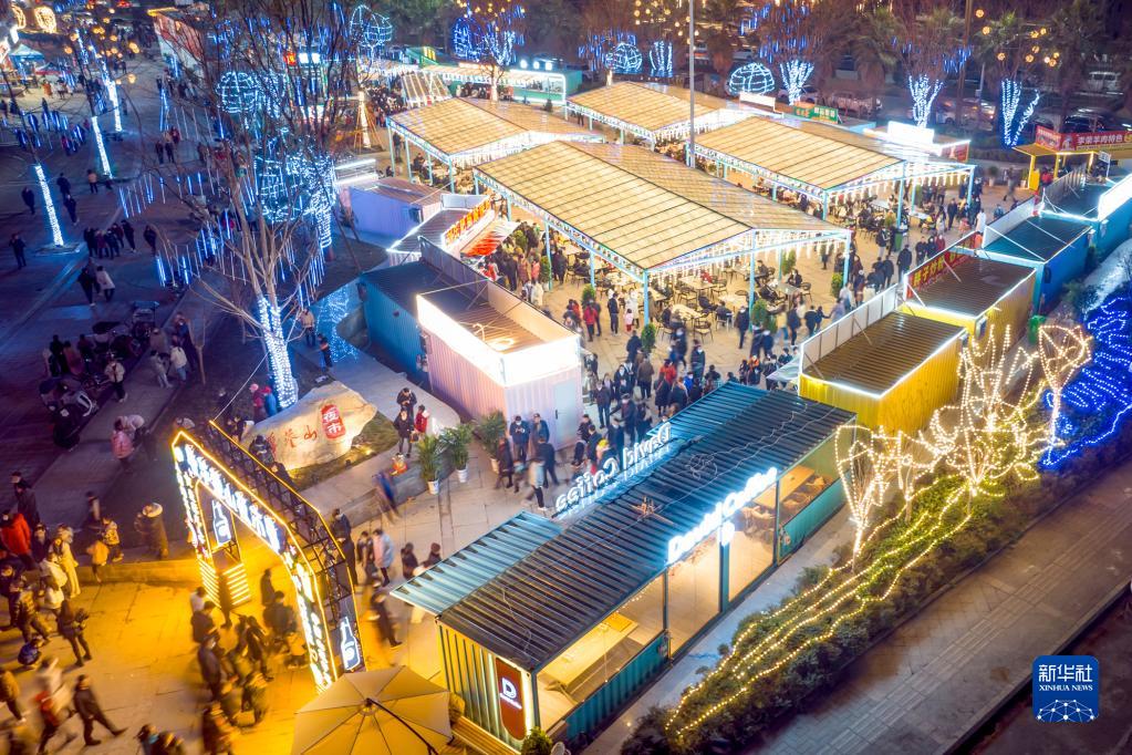 2022年12月31日晚,四川省华蓥市“华蓥山夜市”吸引市民前来购物、品尝美食(无人机照片)。