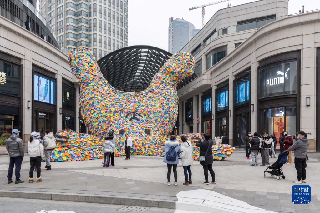 1月1日,市民在上海市静安区南京西路兴业太古汇门口的大型艺术装置“五彩倒立兔”前拍照留影。