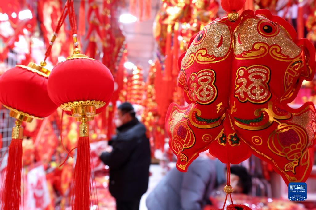 1月1日,人们在山东省枣庄市一处年货市场选购新年饰品。
