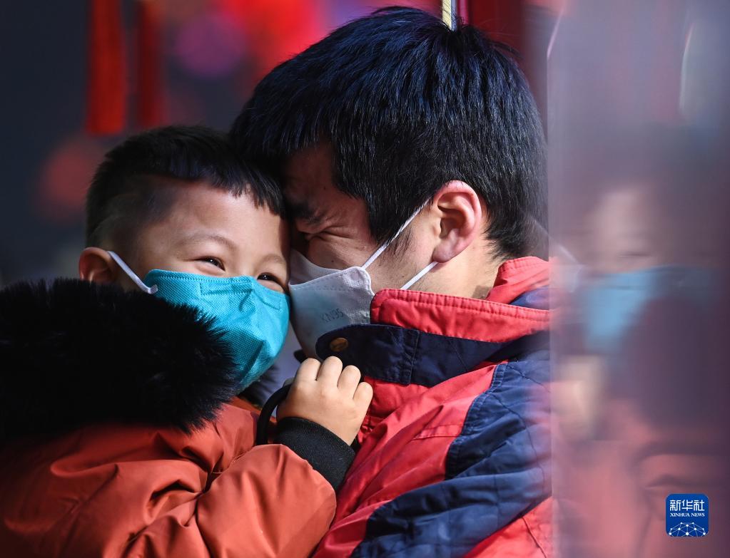 2022年12月31日,在大唐不夜城步行街,一对父子在购买棉花糖时亲密互动。
