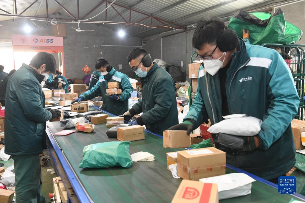 1月1日,在中国邮政集团公司河北新乐市分公司分拣车间,工作人员在分拣快递。