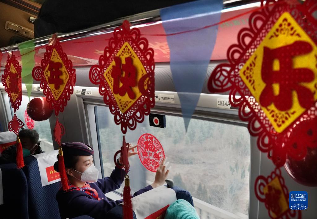 1月1日,列车工作人员在G2023次高铁列车车厢内贴窗花。