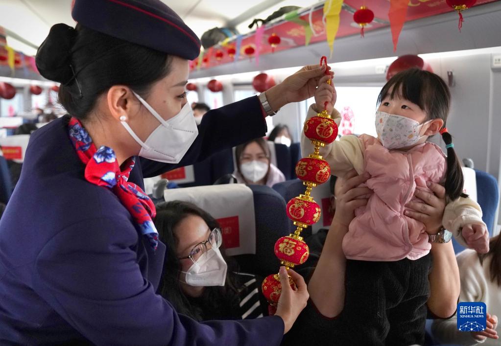 1月1日,列车工作人员在G2023次高铁列车上与小朋友互动。