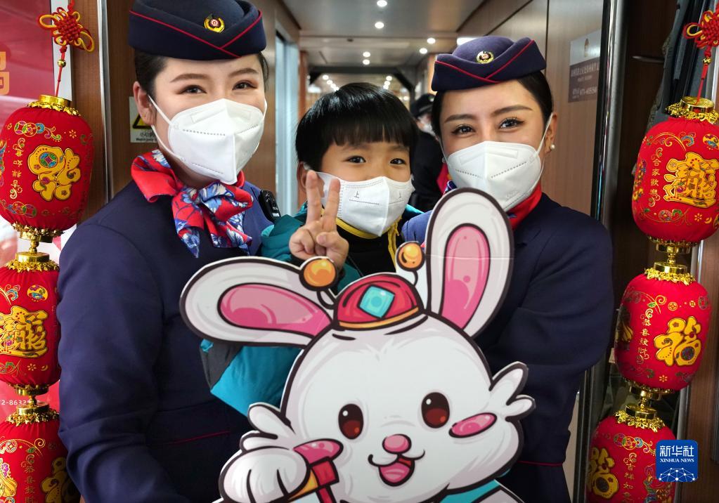 1月1日,列车工作人员在G2023次高铁列车上与小朋友互动。