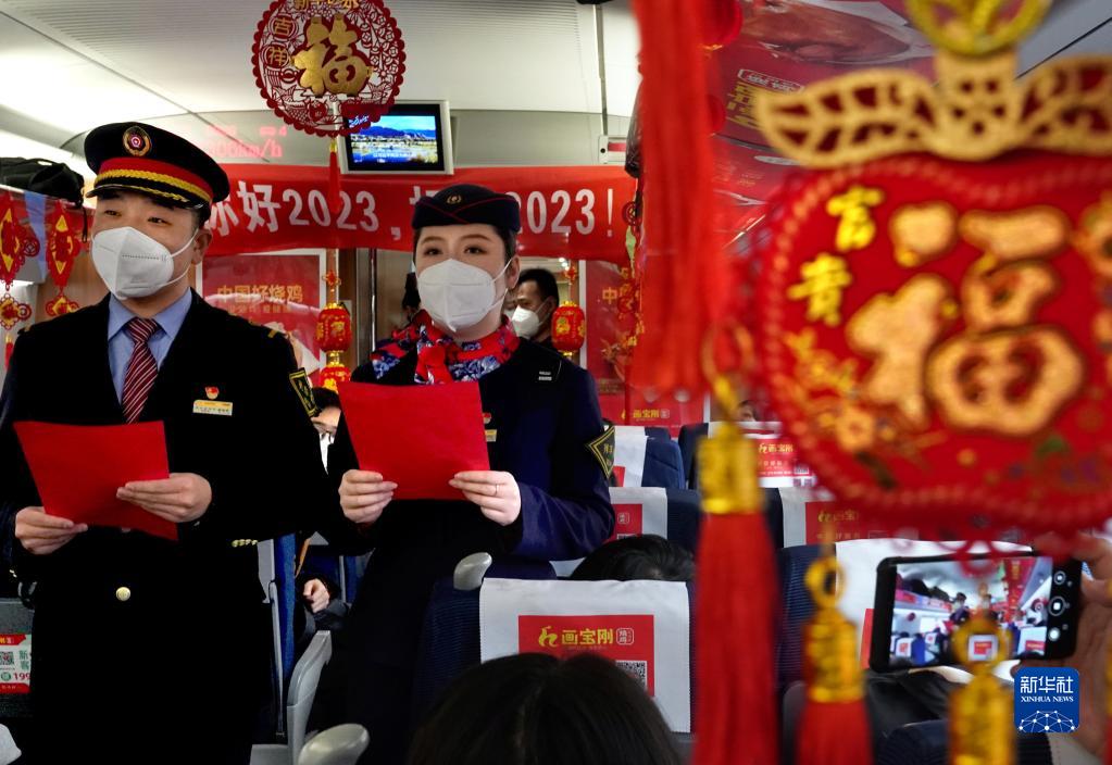 在2023年元旦到来之际,列车工作人员将车厢布置一新,举行了“你好2023,相约2023”贺新年活动,为旅客献上欢快的演出,送上新年的祝福。