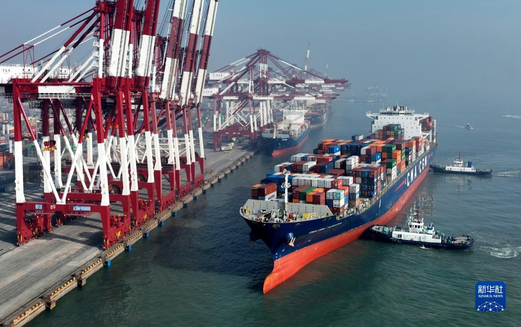 1月1日,满载集装箱的法国“达飞阿玛维瓦”轮正在靠泊青岛港前湾QQCT集装箱码头(无人机照片)。
