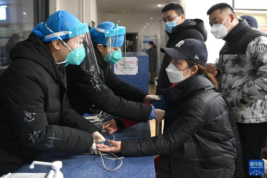 2022年12月31日,西安交通大学第一附属医院急诊科分诊台的医务人员为患者测量脉搏血氧饱和度。