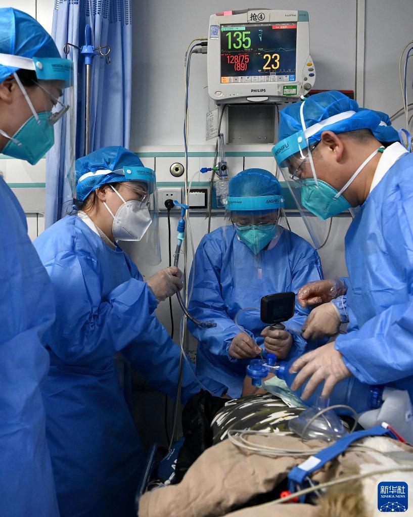 2022年12月31日晚,西安交通大学第一附属医院急诊科的医务人员为病人进行气管插管。