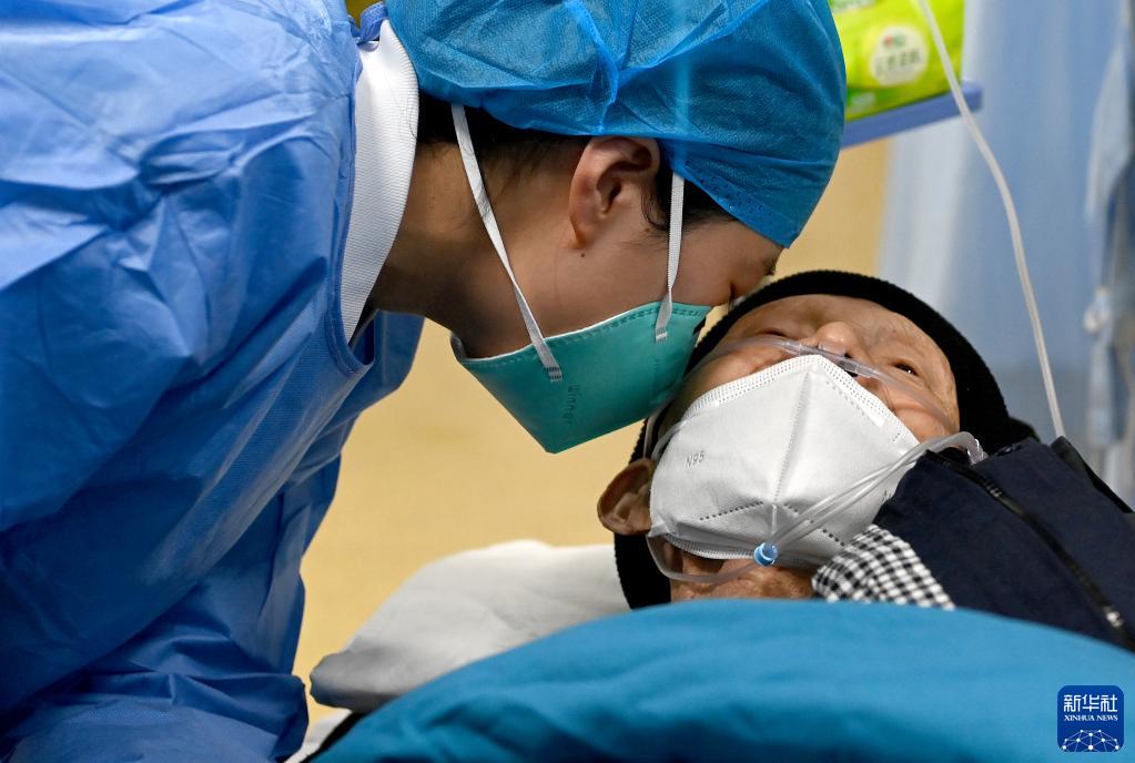 2022年12月31日,西安交通大学第一附属医院急诊科的医务人员靠近一名听力不好的患者进行问询。
