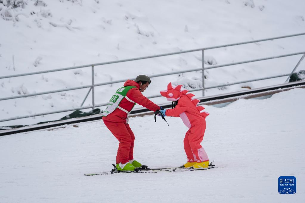 1月1日,在重庆市南川区金佛山景区滑雪场,一名游客(右)在雪场教练的指导下学习滑雪。