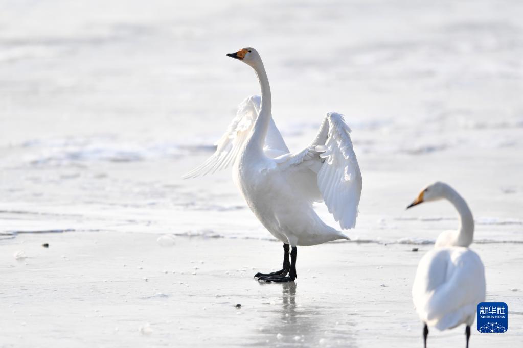 1月2日,大天鹅在三河口天鹅滩湿地嬉戏。