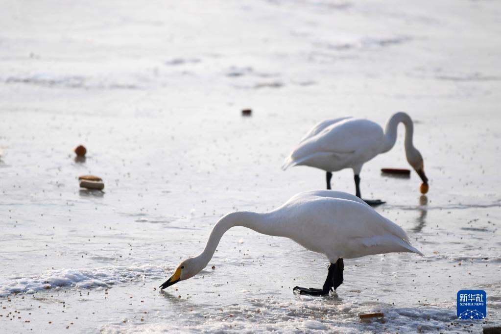 1月2日,大天鹅在三河口天鹅滩湿地觅食。