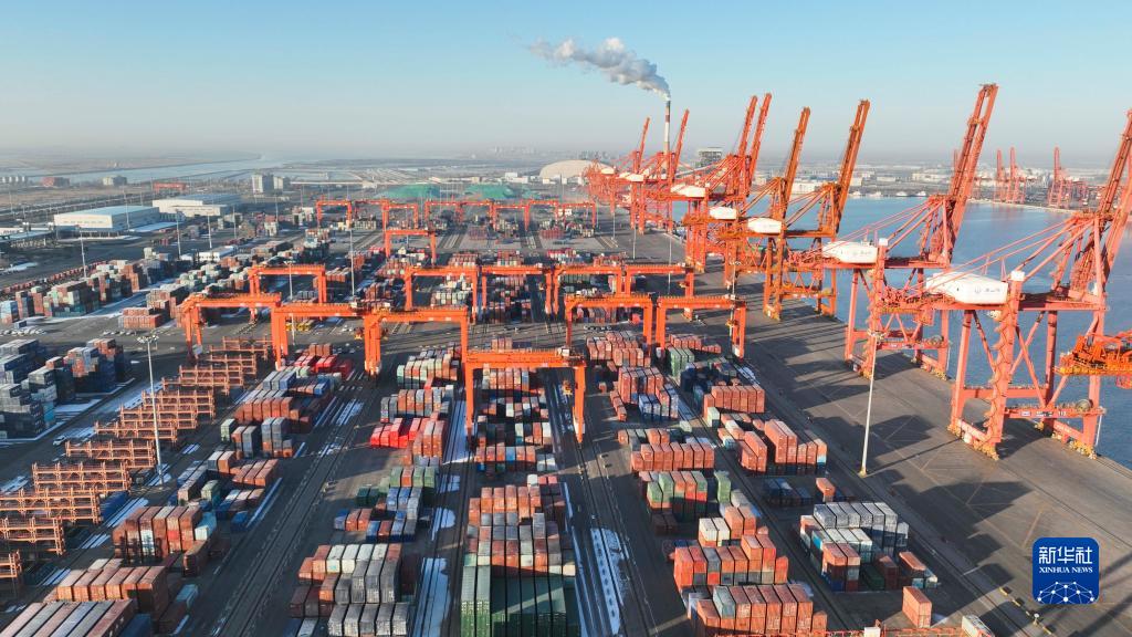 1月3日拍摄的河北唐山港京唐港区集装箱码头(无人机照片)。