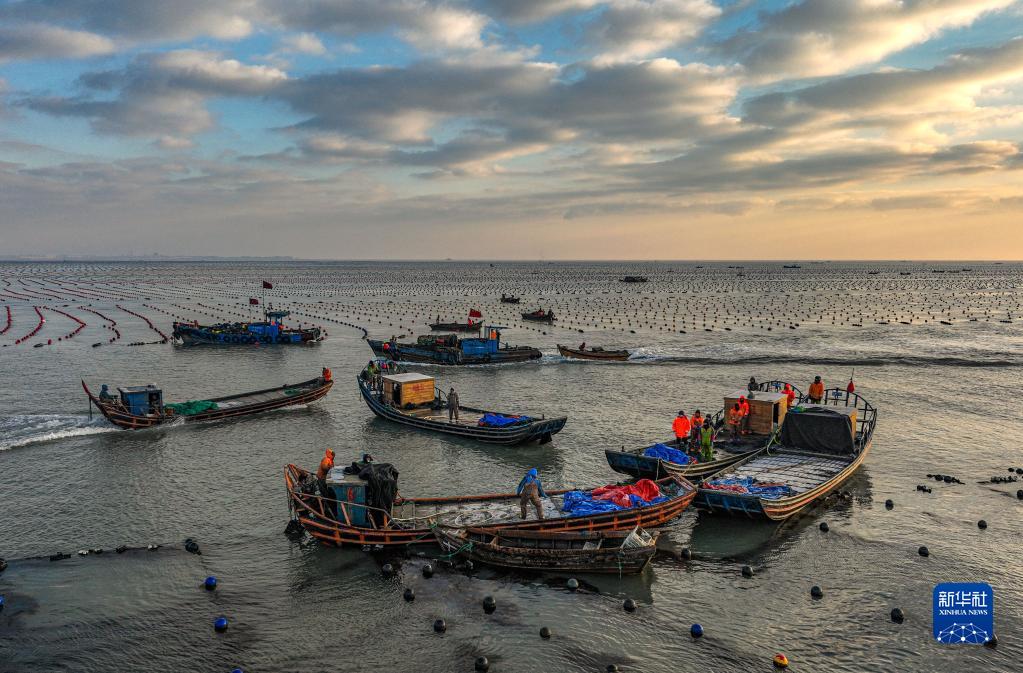 当日,在山东省荣成市寻山街道爱伦湾海洋牧场,渔民驾驶渔船在海上忙碌着,呈现一幅“海上冬耕”的画面。