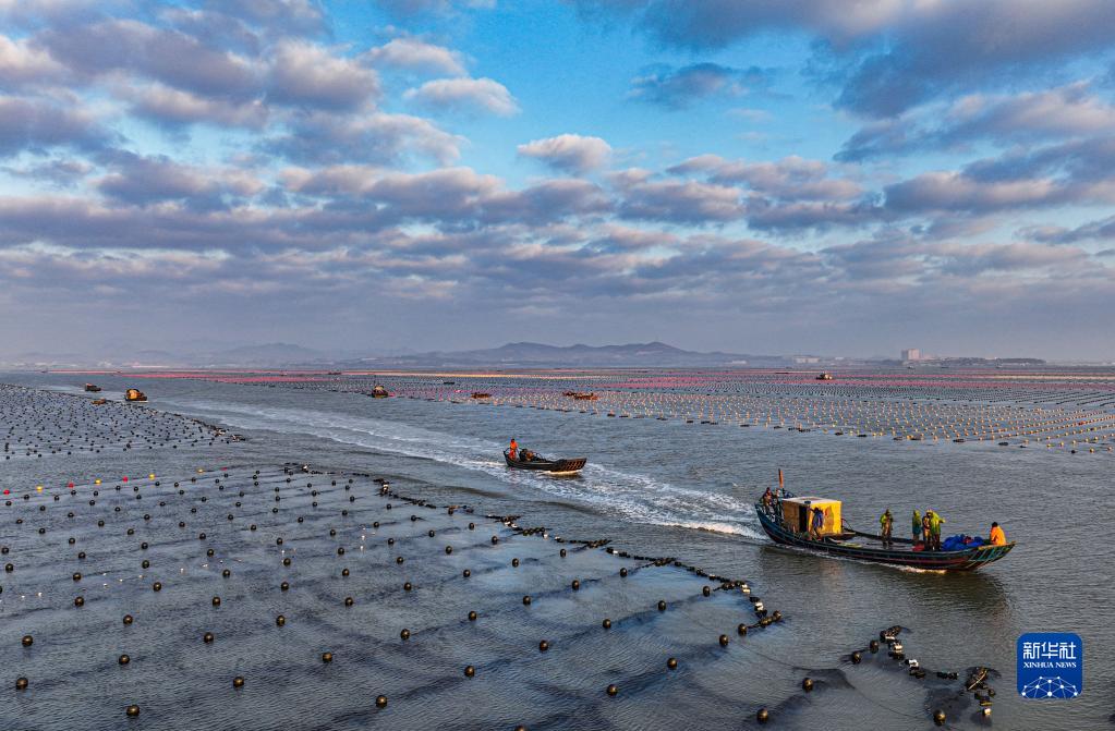 当日,在山东省荣成市寻山街道爱伦湾海洋牧场,渔民驾驶渔船在海上忙碌着,呈现一幅“海上冬耕”的画面。