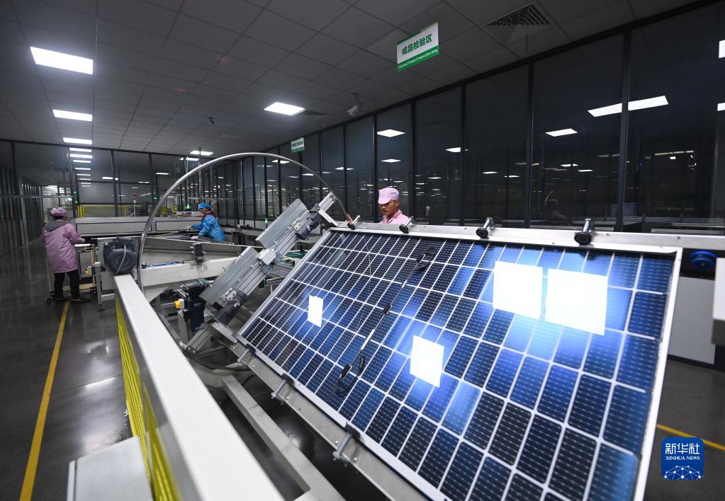 1月3日,工人在浙江格普光能科技有限公司的车间内检验光伏组件成品。
