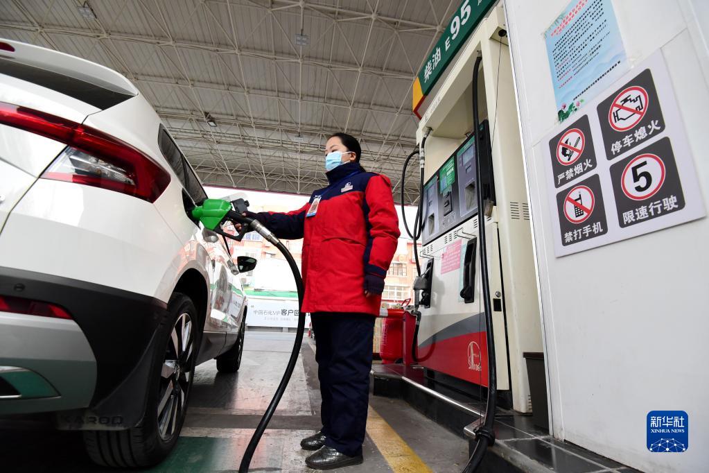 1月3日,河北省邯郸市丛台区一家加油站的工作人员给车辆加油。
