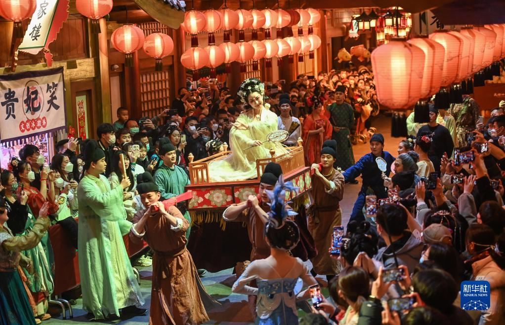 2022年12月31日,游客在陕西西安长安十二时辰主题街区观看表演。