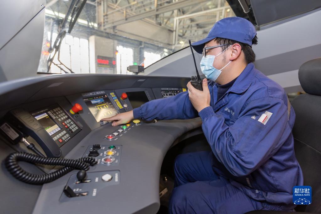 1月3日,在上海虹桥动车运用所,动车组机械师与车下作业人员进行沟通,开展制动试验。