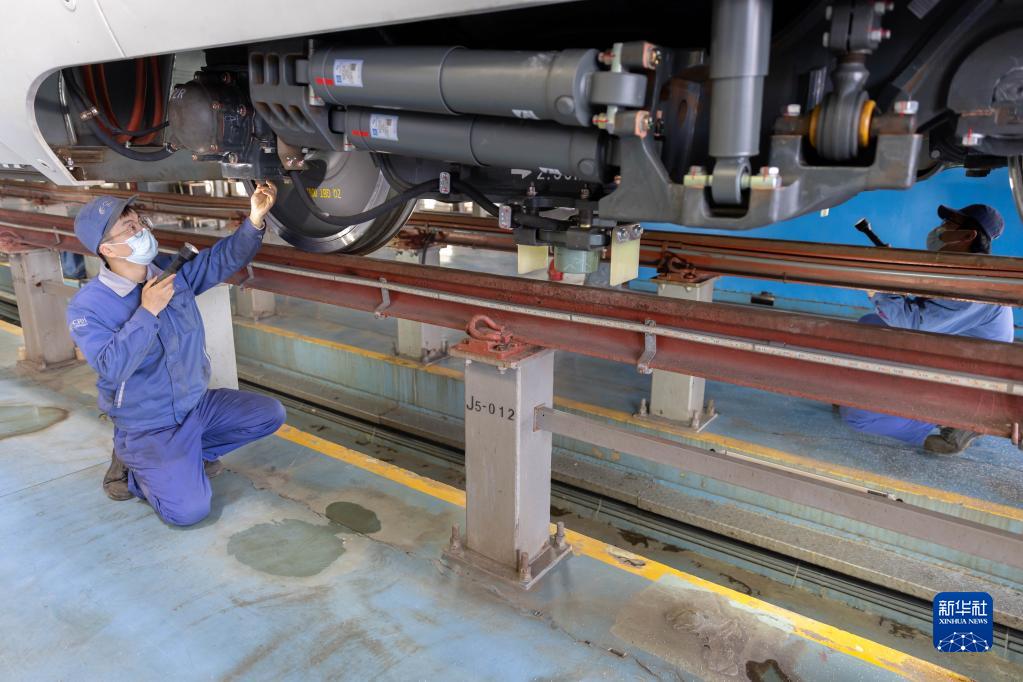 2023年春运即将到来,上海动车段虹桥动车运用所加紧开展高铁检修工作,保障春运安全。