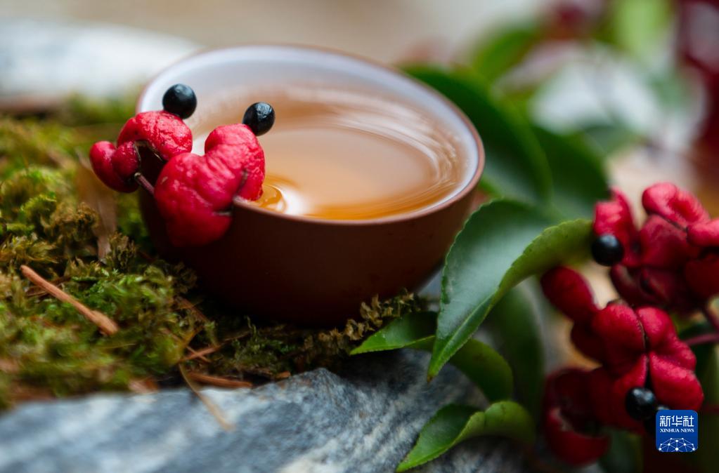 1月1日在福建省武夷山国家公园拍摄的野鸭椿果实。这是当地小寒时节的特色野果,因其果实形似孩童,当地人称其为“红袍娃”。