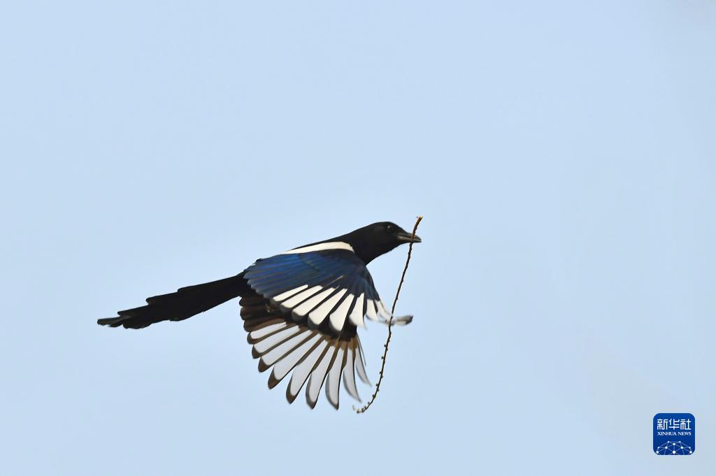 1月1日,在山东省滕州市西岗镇,喜鹊叼着树枝准备筑巢。