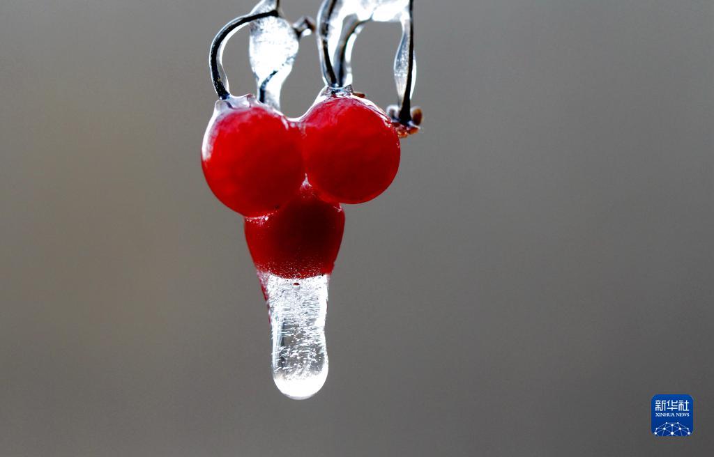 1月1日,在山东省邹平市南洞村,野生的小红果上挂着冰。