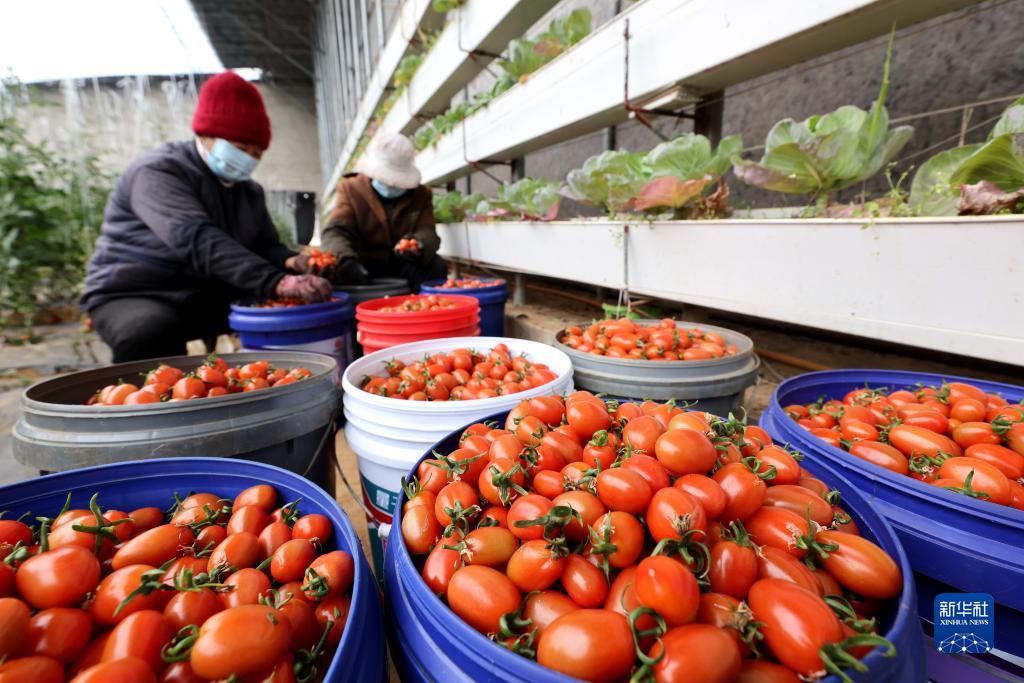 1月4日,山东省枣庄市西王庄镇付刘耀村农民在大棚里分拣采摘的圣女果。