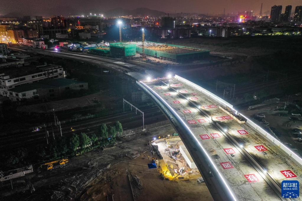 这是转体成功后的转体梁上跨广深铁路(1月4日摄,无人机照片)。