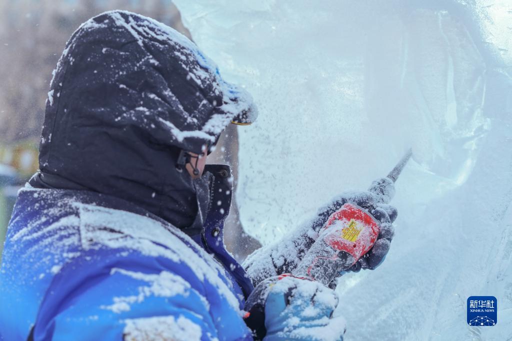 1月4日,在哈尔滨冰灯艺术游园会园区,冰雕师在进行冰雕艺术作品创作。